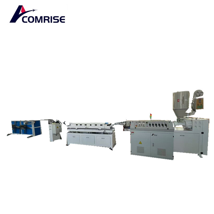原材料+添加剤→ミキシング→真空フィーダー→ホッパードライヤー→シングルスクリュー押出機→カラーコード押出機→金型およびキャリブレーター→真空形成機→冷却タンク→トレーラー→カッティングマシン→巻き機